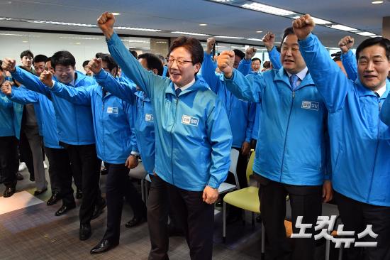 바른정당 유승민 대선후보가 5일 오후 여의도 당사에서 열린 중앙선대위 발대식에서 동료의원들과 구호를 외치고 있다.