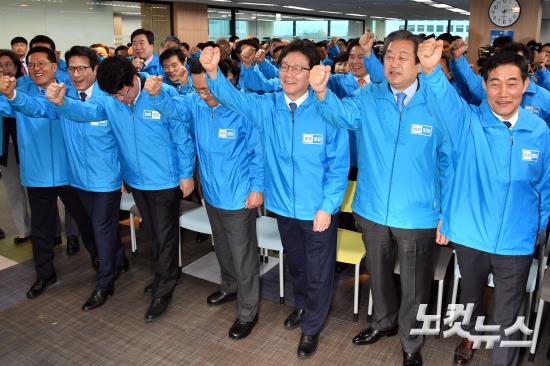 바른정당 유승민 대선후보가 5일 오후 여의도 당사에서 열린 중앙선대위 발대식에서 동료의원들과 구호를 외치고 있다.