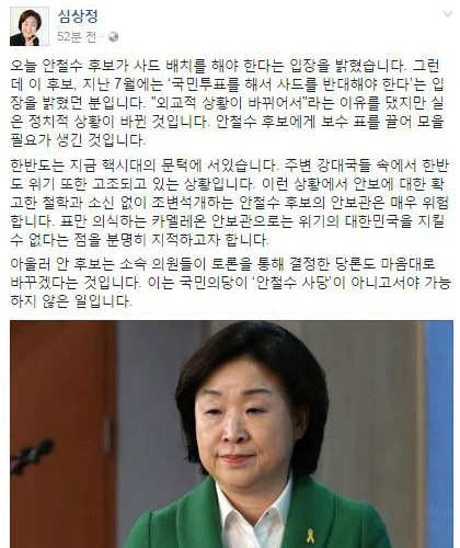 심 후보는 6일 페이스북에 "안철수 후보가 사드 배치를 해야한다는 입장을 밝혔다. 보수 표를 끌어모을 필요가 생긴 것이다"라고 쓴소리를 했다.