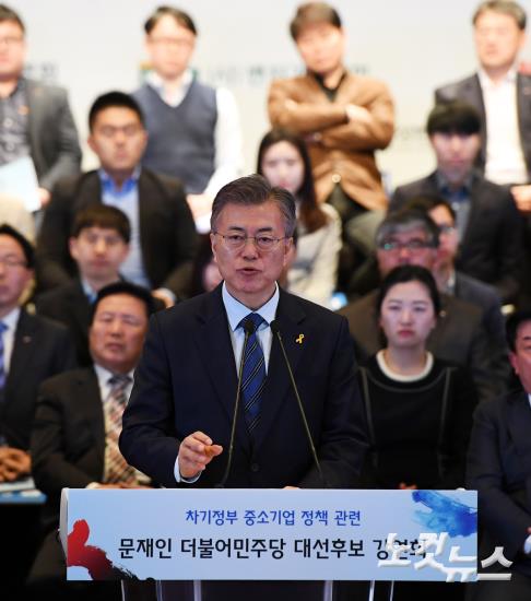 문재인 더불어민주당 대선후보가 10일 오전 서울 여의도 중소기업중앙회에서 열린 ‘차기정부 중소기업 정책 관련 강연회’ 에 참석해 중소기업 정책을 공약을 발표하고 있다.