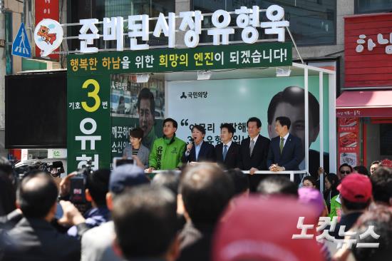 안철수 국민의당 대선후보가 10일 오후 경기도 하남시에서 4·12 경기 하남시장 보궐선거에 출마한 국민의당 유형욱 후보를 지원유세하고 있다.