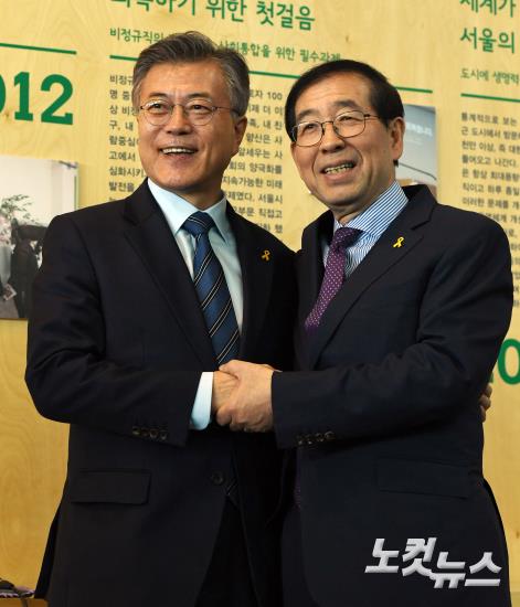 10일 오후 서울시청을 방문한 문재인 더불어민주당 대선후보가 박원순 서울시장과 포옹하고 있다.