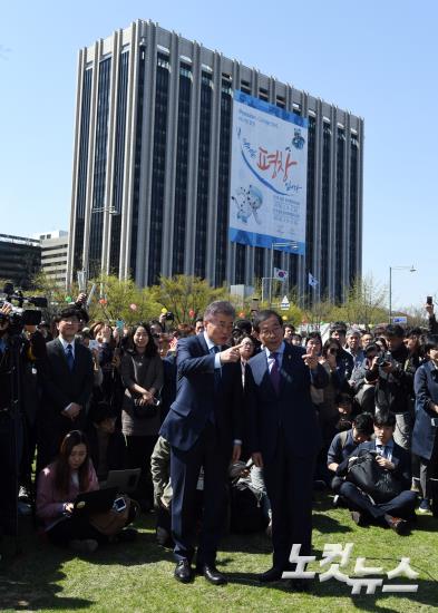 10일 오후 서울 광화문광장을 방문한 문재인 더불어민주당 대선후보가 박원순 서울시장과 함께 광화문광장 재구조화 취지 경청하고 있다.