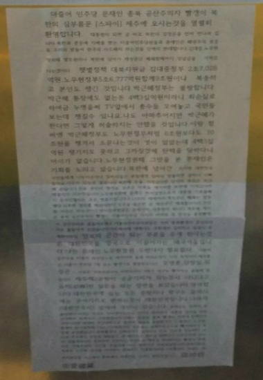 K씨가 제주도내 주요 장소에 붙인 문재인 더불어민주당 대선후보 비방글. (사진=제주지방경찰청 제공)