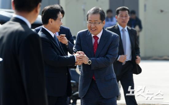 자유한국당 홍준표 대선 후보가 11일 오전 파주 임진각 테마공원에서 대국민 호소문을 발표에 앞서 관계자와 인사를 하고 있다.