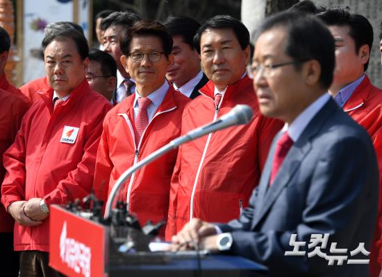 자유한국당 홍준표 대선 후보가 11일 오전 파주 임진각 테마공원에서 대국민 호소문을 발표하는 가운데 당원들이 홍준표 후보를 바라보고 있다.