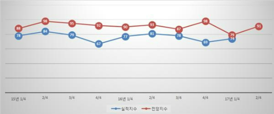 이번 조사 결과, 지난 1분기 79에 비해서는 12포인트 증가했지만, 기준치 100에는 미치지 못한 것으로 대통령 탄핵에 따른 최악의 기업심리에서는 벗어났지만, 경기 회복에 장밋빛 전망을 내놓지는 않은 셈.