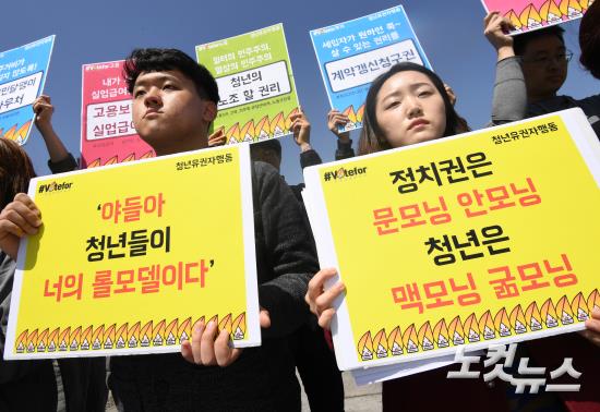 2017 촛불대선 청년유권자 행동 회원들이 12일 오후 서울 광화문광장에서 '시민들은 대선날짜를 바꾸었는데 후보들은 무엇을 바꾸고 있습니까? 라는 주제로 기자회견을 하고 있다.