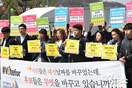 2017 촛불대선 청년유권자 행동 회원들이 12일 오후 서울 광화문광장에서 '시민들은 대선날짜를 바꾸었는데 후보들은 무엇을 바꾸고 있습니까? 라는 주제로 기자회견을 하고 있다.