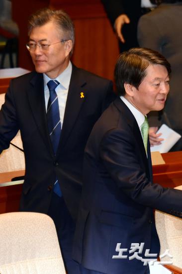 더불어민주당 문재인 대선후보와 국민의당 안철수 대선후보가 12일 국회에서 열린 대통령후보의 개헌관련 의견청취를 위한 헌법개정특별위원회 전체회의를 마치고 참석자들과 악수를 하고 있다.