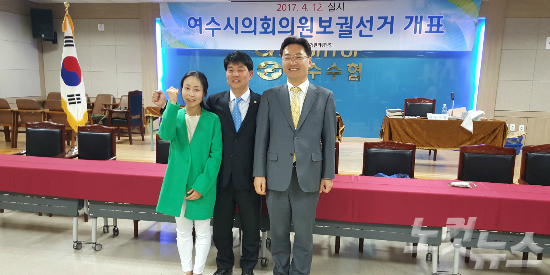 우측부터 여수시 선관위원장인 김순열 광주지법 순천지원 부장판사, 이정만 당선인, 이정만 당선인 아내가 당선 확정 직후 밝은 표정을 짓고 있다. (사진=고영호 기자)