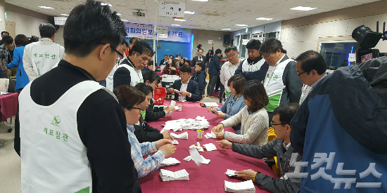 여수시의원 보궐선거 각 후보 측 개표 참관인들이 개표 상황을 지켜보고 있다. (사진=고영호 기자)