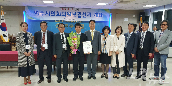 이정만 당선인이 당선증을 들고 여수시 선관위원들과 기념촬영을 했다. (사진=고영호 기자)