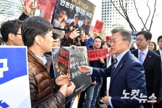 더불어민주당 문재인 대선후보가 13일 오전 서울 마포구 상암동 SBS 프리즘 타워에서 열린 SBS와 한국기자협회 공동 주최 대선후보 합동토론회에 참석하며 피켓 시위를 벌이는 언론노조 회원들과 인사를 하고 있다.