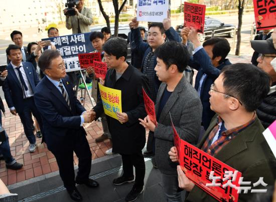 더불어민주당 문재인 대선후보가 13일 오전 서울 마포구 상암동 SBS 프리즘 타워에서 열린 SBS와 한국기자협회 공동 주최 대선후보 합동토론회에 참석하며 피켓 시위를 벌이는 언론노조 회원들과 인사를 하고 있다.