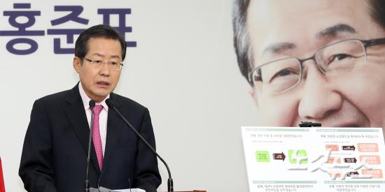 자유한국당 홍준표 대선후보가 14일 오전 여의도 당사에서 가계통신비 부담을 줄이면서 저소득층의 복지를 제고하는 가계통신비 공약을 발표하고 있다.