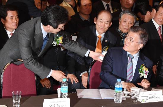 더불어민주당 문재인(오른쪽) 대선 후보와 바른정당 유승민 대선 후보가 14일 오후 서울 여의도 63빌딩에서 열린 대선후보 초청 직능·시민단체 전국대표자대회에서 인사하고 있다.