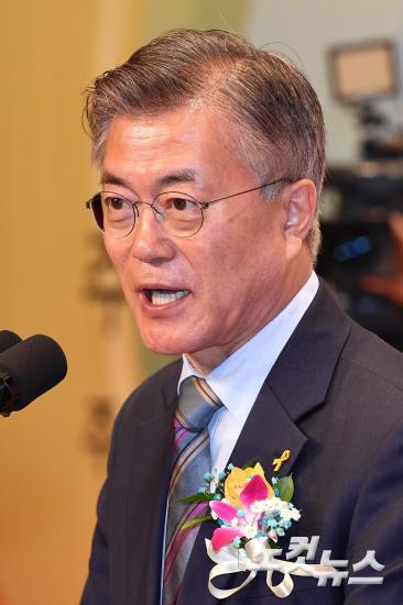더불어민주당 문재인 대선 후보가 14일 오후 서울 여의도 63빌딩에서 열린 대선후보 초청 직능·시민단체 전국대표자대회에서 축사를 하고 있다.