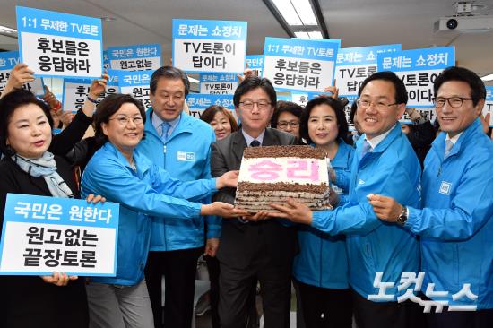 바른정당 유승민 대선후보가 14일 오후 여의도 당사에서 열린 '유승민 후보 지지 전국여성대회'에서 여성지지자들이 전달한 승리의 떡을 들어보이고 있다.