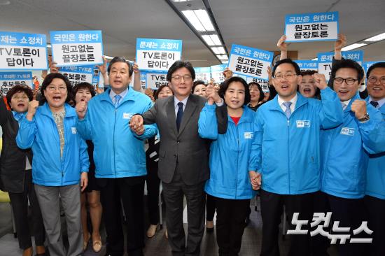 바른정당 유승민 대선후보가 14일 오후 여의도 당사에서 열린 '유승민 후보 지지 전국여성대회'에서 주호영 원내대표, 김무성 고문을 비롯한 여성지지자들과 파이팅을 외치고 있다.