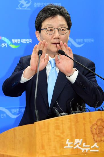 바른정당 유승민 대선후보가 15일 오후 경기도 과천 중앙선거관리위원회에서 대통령 후보자 등록을 마치고 기자회견을 준비하며 마이크를 만지고 있다.