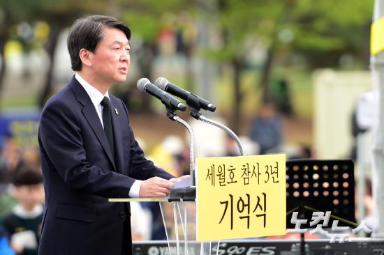 세월호 참사 3주기인 16일 오후 경기도 안산시 세월호 참사 정부 합동 분향소에서 열린 추모식에 참석한 국민의당 안철수 대선후보가 단상에 올라 발언을 하고 있다.