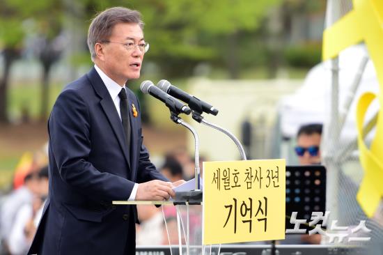 세월호 참사 3주기인 16일 오후 경기도 안산시 세월호 참사 정부 합동 분향소에서 열린 추모식에 참석한 더불어민주당 문재인 대선후보가 단상에 올라 발언을 하고 있다.
