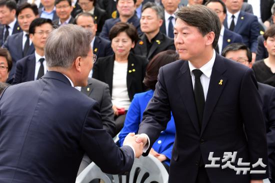 세월호 참사 3주기인 16일 오후 경기도 안산시 세월호 참사 정부 합동 분향소에서 열린 추모식에 참석한 더불어민주당 문재인 대선후보와 국민의당 안철수 대선후보가 악수를 하고 있다.