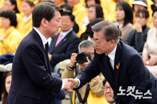 세월호 참사 3주기인 16일 오후 경기도 안산시 세월호 참사 정부 합동 분향소에서 열린 추모식에 참석해 발언을 마치고 자리로 돌아가는 국민의당 안철수 대선후보에게 더불어민주당 문재인 대선후보가 손을 내밀어 악수를 하고 있다.