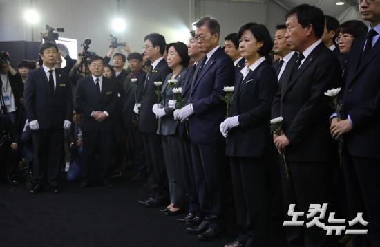 세월호 3주기 추모식에 참석한 각 당 대선후보들이 16일 오후 경기도 안산시 단원구 세월호 정부합동분향소에서 조문하고 있다. (앞줄 왼쪽 네번째부터) 더불어민주당 문재인, 국민의당 안철수, 정의당 심상성, 바른정당 유승민 후보.
