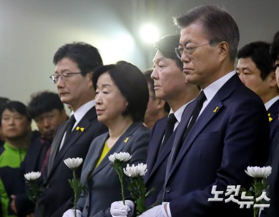 세월호 3주기 추모식에 참석한 각 당 대선후보들이 16일 오후 경기도 안산시 단원구 세월호 정부합동분향소에서 조문하고 있다. (앞줄 왼쪽부터) 더불어민주당 문재인, 국민의당 안철수, 정의당 심상성, 바른정당 유승민 후보.