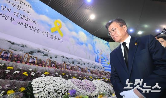 세월호 참사 3주기에 각 당 대선 후보들이 안산을 찾았다. ‘세월호 참사 3년 기억식(추모식)’이 거행된 16일 경기도 안산시 세월호 참사 희생자 합동분향소에서 더불어민주당 문재인 후보가 희생자들의 넋을 기리고 있다.