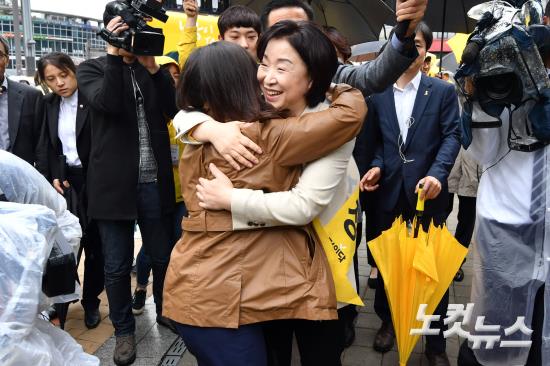 정의당 심상정 대선후보가 제19대 대통령선거 공식 선거운동이 시작된 17일 오전 서울 구로디지털단지역 인근에서 대통령 선거 출정식을 가진 뒤 한 지지자와 포옹을 하고 있다.