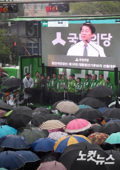 안철수 대선후보, 빗속 유세