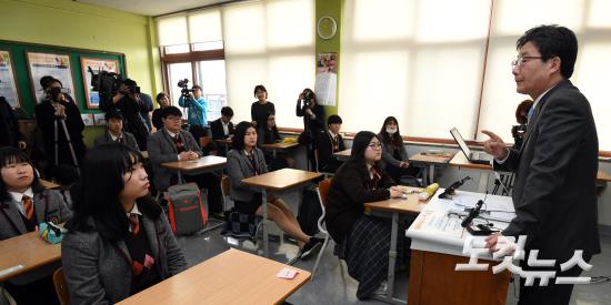 일일교사로 나선 바른정당 유승민 대선후보가 18일 오전 경기도 김포 하성면 하성고등학교에서 강의 후 학생들의 질문에 답하고 있다.