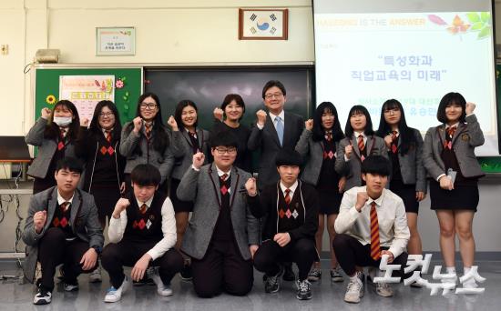 일일교사로 나선 바른정당 유승민 대선후보가 18일 오전 경기도 김포 하성면 하성고등학교에서 강의를 마치고 학생들과 기념촬영 하고 있다.