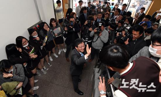 일일교사로 나선 바른정당 유승민 대선후보가 18일 오전 경기도 김포 하성면 하성고등학교에서 강의를 마치고 학생들과 인사나누고 있다.