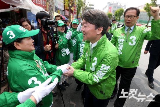 국민의당 안철수 대선후보가 18일 오전 대전 동구 중앙시장을 찾아 유세단원들을 격려하고 있다.