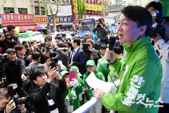 국민의당 안철수 대선후보가 18일 오전 대전 동구 대전역 앞 중앙시장 일대에서 선거유세를 하고 있다.