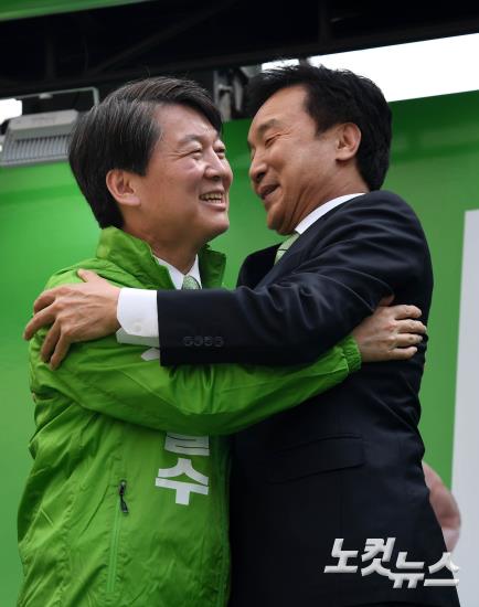 국민의당 안철수 대선후보(오른쪽)가 18일 오후 대구 동성로 대구백화점 일대에서 선거유세를 마치고 손학규 상임위원장과 포옹을 하고 있다.
