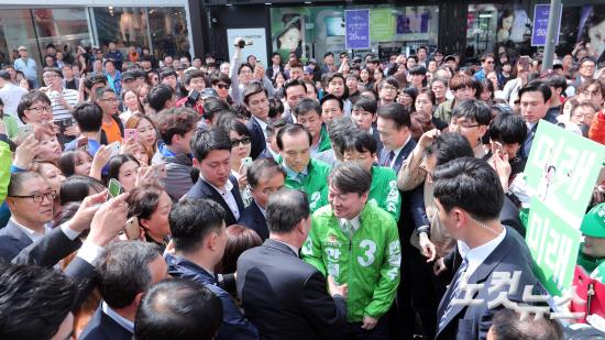 국민의당 안철수 대선후보가 18일 오후 대구 동성로 대구백화점 일대에서 선거유세 전 지지자들과 악수를 하고 있다.