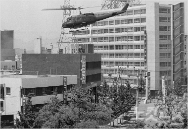 80년 5.18 당시 군 헬기가 전일빌딩 주변을 비행하고 있다. (사진=5.18기념재단 제공)