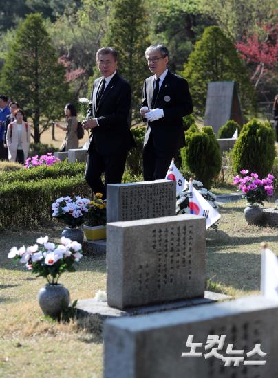 더불어민주당 문재인 후보가 19일 오전 서울 도봉구 국립 4.19민주묘지를 찾아 참배한 뒤 김주열 열사 묘역을 둘러보고 있다.