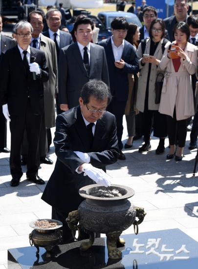 자유한국당 홍준표 대선후보가 19일 오전 서울 강북구 국립 4·19 민주묘지를 찾아 참배를 하기 위해 들어서고 있다