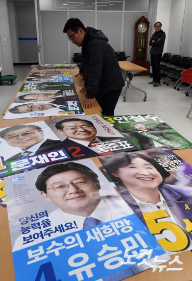 19일 서울 종로구 서울시선거관리워원회에서 관계자들이 도착학 대선후보 벽보를 살펴보고 있다.