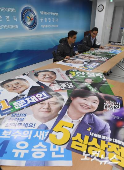 19일 서울 종로구 서울시선거관리워원회에서 관계자들이 도착학 대선후보 벽보를 살펴보고 있다.