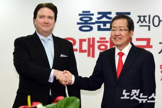 악수하는 자유한국당 홍준표 대선 후보-마크 내퍼 주한 미국대사 대리