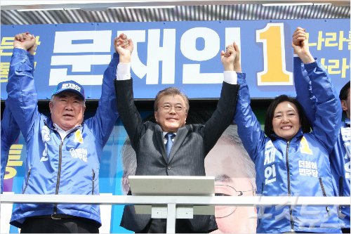 문재인 더불어민주당 대선 후보가 18일 제주 동문시장 거리유세에서 지지를 호소하고있다. 문준영 기자