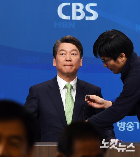 국민의당 안철수 대선후보가 20일 오전 서울 여의도 마리나센터 컨벤션홀에서 열린 ‘방송기자클럽 초청 토론회’ 에 참석해 마이크를 착용하고 있다.