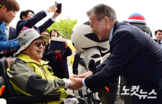 더불어민주당 문재인 대선 후보가 20일 강원 춘천 강원대학교 백령아트센터에서 열린 37회 장애인의 날 기념식에 참석한 한 장애인과 인사하고 있다.